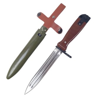 Chiński wojskowy bagnet do karabinu AK Type 81. Obustronne ostrze, podwójne zbrocze, wzmacniana głownia. Na rękojeści otwór do zamocowania linki. Pochwa z tworzywa sztucznego.